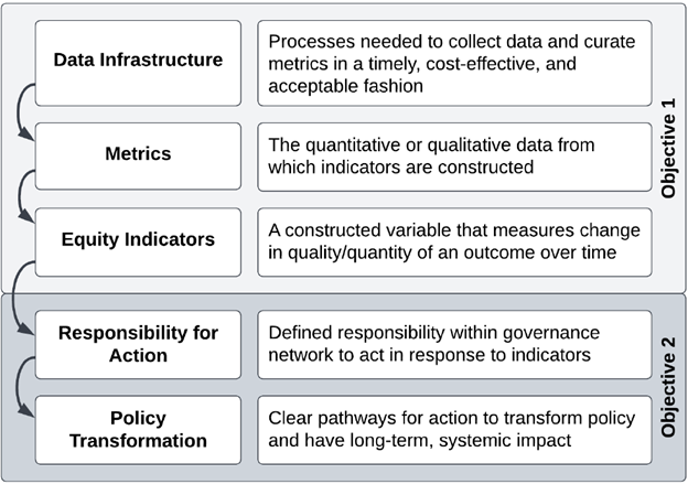 Evaluate the construction of responsibility for action within governance networks and the pathways for action to produce long-term, systemic policy transformation in order to institutionalize equity as a valued priority